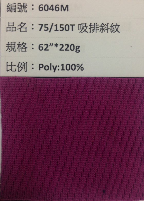 編號:6046M品名:75/150T吸排斜紋顏色:桃粉E80C規格:69"*220g